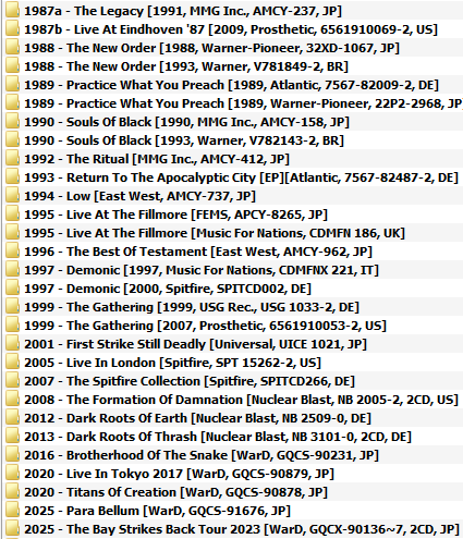 | Testament - Discography (1987-2025) Artist: Testament Album: Discography Year: 1987-2025 Genre | Style: Thrash Metal Codec & Type: FLAC (image+.cue+log) ✪ Tracklist: ✪01. For the Love of Pain (5:35)02. Infanticide A.I. (3:28)03. Shadow People (5:45)04. Meant to Be (7:33)05. High Noon (3:53)06. Witch Hunt (4:16)07. Nature of the Beast (4:28)08. Room 117 (4:18)09. Havana Syndrome (4:40)10. Para Bellum (6:31) Доступно только для пользователей