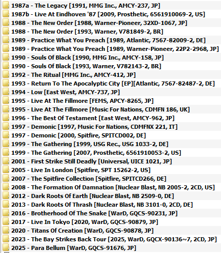 | Testament - Discography (1987-2025) Artist: Testament Album: Discography Year: 1987-2025 Genre | Style: Thrash Metal Codec & Type: FLAC (image+.cue+log) ✪ Tracklist: ✪01. For the Love of Pain (5:35)02. Infanticide A.I. (3:28)03. Shadow People (5:45)04. Meant to Be (7:33)05. High Noon (3:53)06. Witch Hunt (4:16)07. Nature of the Beast (4:28)08. Room 117 (4:18)09. Havana Syndrome (4:40)10. Para Bellum (6:31) Доступно только для пользователей